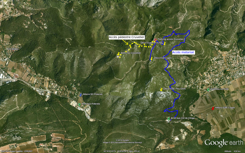 Tous les atterros de Cuges et du Cruvelier sont desservis par la Ligne 11 du Bus de l’Agglo « Liberté Égalité Gratuité », transport gratuit qui vous ramènera en dix minutes maxi au Col de l’Ange.