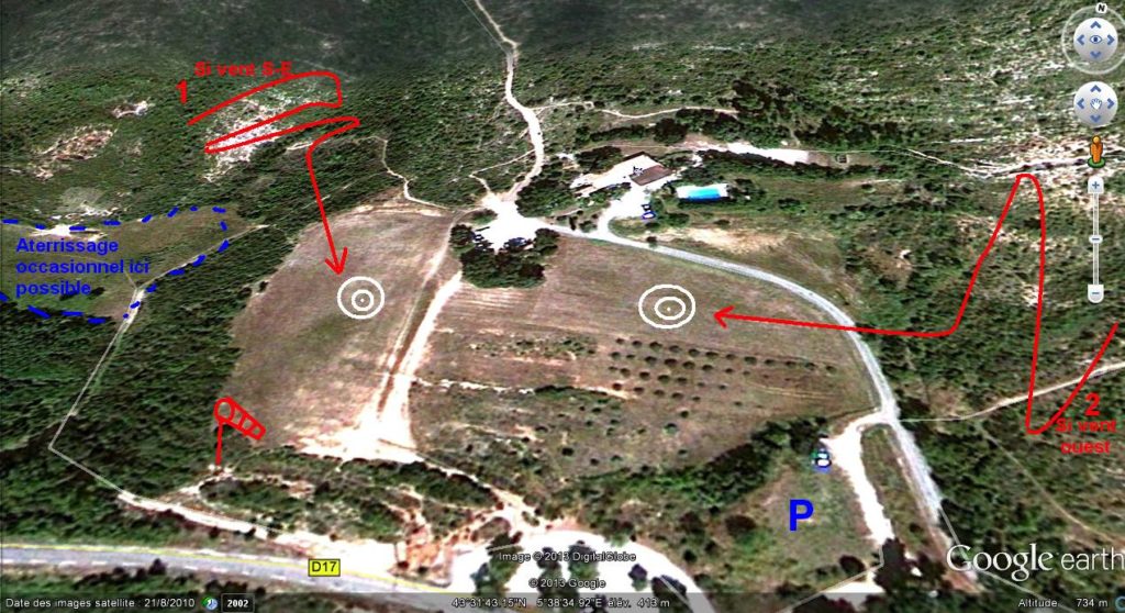- Soit on prend assez de gaz pour basculer sur Cuges, avec atterrissage sur les terrains officiels( attention aux rouleaux si on est à trop faible altitude avec du vent soutenu).Quand c’est faisable, c’est la meilleure solution.